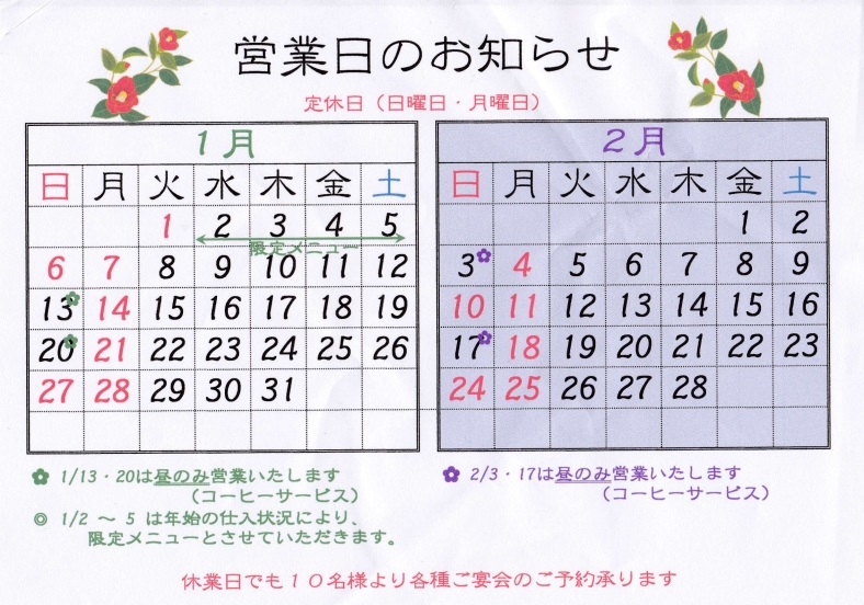 令和2年1月19日(日)・1月26日(日)は昼のみ営業致します。