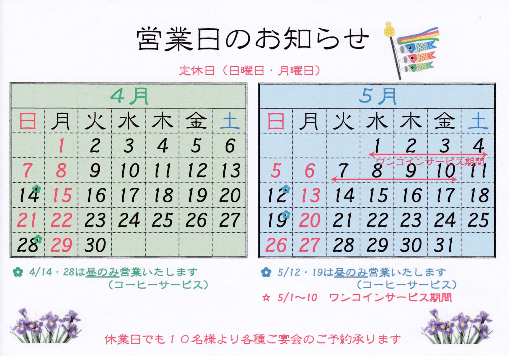 5月6日(日)・5月27日(日)は、昼のみ営業致します。(コーヒーサービス)