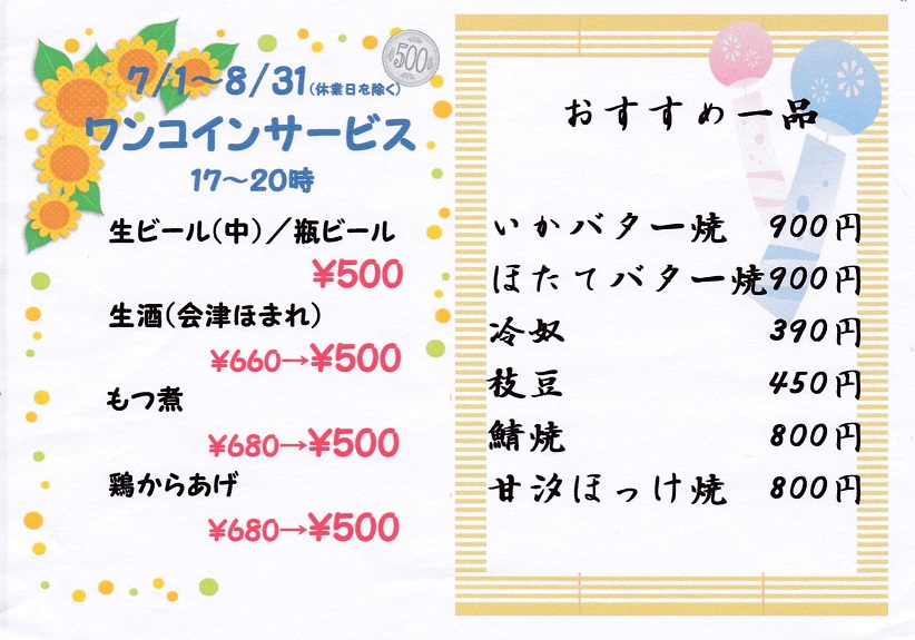 今年もやります、夏のドリンクサービス&ワンコインサービス!