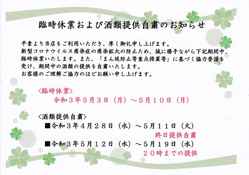 令和2年5月3日(日)・5月10日(日)・5月17日(日)・5月24日(日)は昼のみ営業致します。
